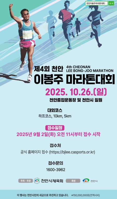 [뉴스노크=김인호 기자] 천안시체육회는 ‘제4회 천안이봉주마라톤대회’ 참가자를 다음 달 2일부터 선착순 모집한다고 25일 밝혔다.