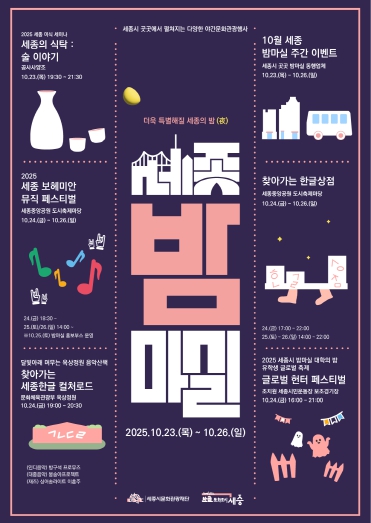 한편 2025년 세종 밤마실 주간은 4월, 6월, 9월, 10월, 12월 총 5회에 걸쳐 운영되며, 자세한 문의는 전략기획팀을 통해 가능하다.