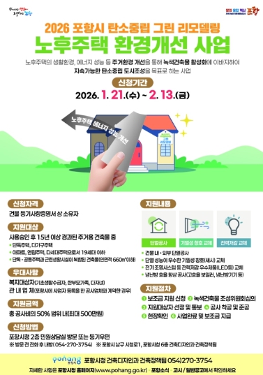 [뉴스노크=김인호 기자] 포항시는 노후주택의 주거환경 개선과 에너지 비용 절감을 위해 2026년도 그린리모델링 지원사업을 시행한다.
