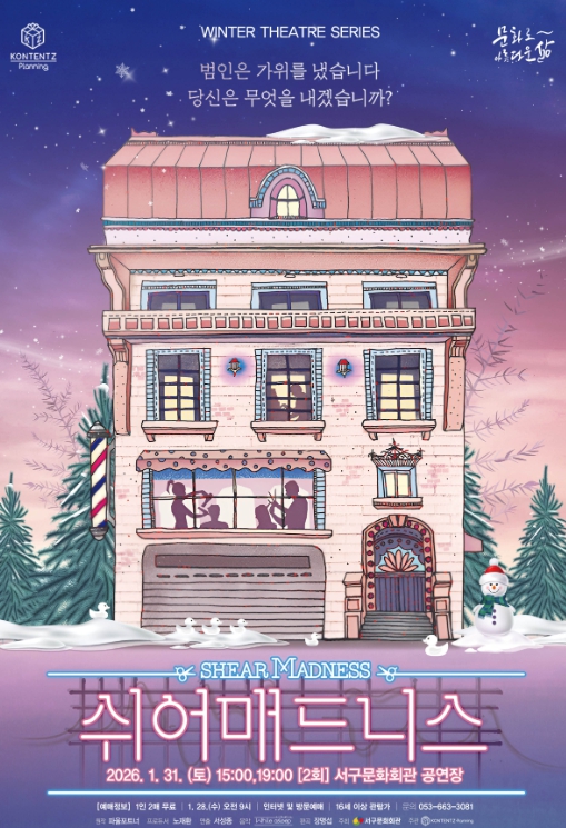 [뉴스노크=김인호 기자] 서구문화회관은‘Winter Theatre Seires(겨울 연극 시리즈)’의 첫 번째 순서로 연극'쉬어매드니스'를 1월 31일 오후 3시, 7시 (2회) 무대에 올린다.