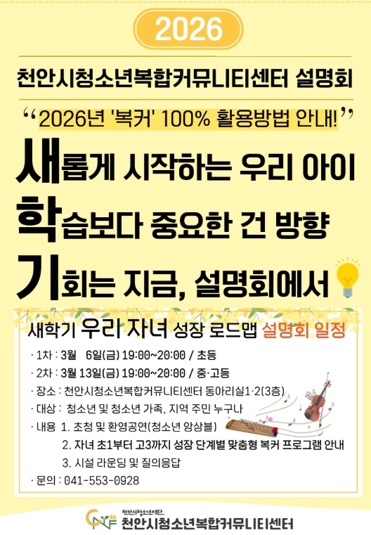 [뉴스노크=김인호 기자] 천안시청소년재단 산하 천안시청소년복합커뮤니티센터는 오는 6일과 13일 두 차례에 걸쳐 ‘새 학기 우리 자녀 성장 로드맵’ 설명회를 개최한다.