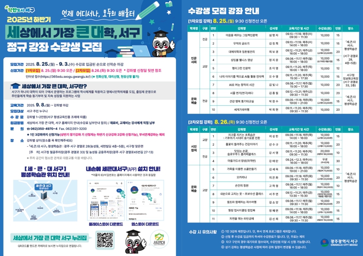 하반기 정규강좌는 9월8일부터 11월21일까지 세큰대서구 평생학습관(경열로28, 4~5층), 서구청 정보화교육장(경열로33, 2층)에서 진행되며 인문사회, 문화예술, 시민참여 등 3개 학과에서 총 24개 프로그램이 운영된다.