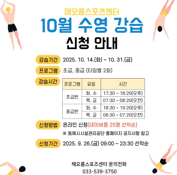 9월 강습이 조기 마감된 데 이어, 10월 강습 접수는 9월 26일 오전 9시부터 동해시시설관리공단 홈페이지에 안내되는 네이버 폼 링크를 통해 선착순으로 진행될 예정이다.