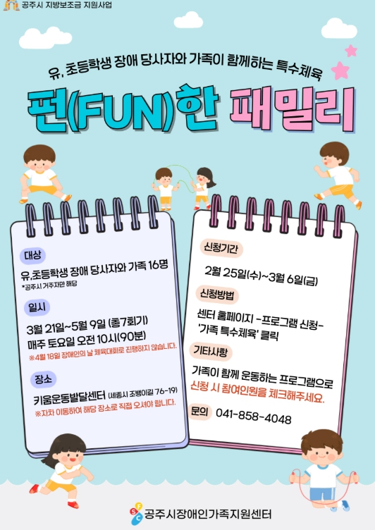 이번 프로그램은 공주시에 거주하는 장애인 가족에게 운동을 통한 정서적 교류의 기회를 제공하기 위해 마련됐다. 농구, 축구, 배드민턴 등 가족이 함께 참여할 수 있는 다양한 체육활동으로 구성된다.