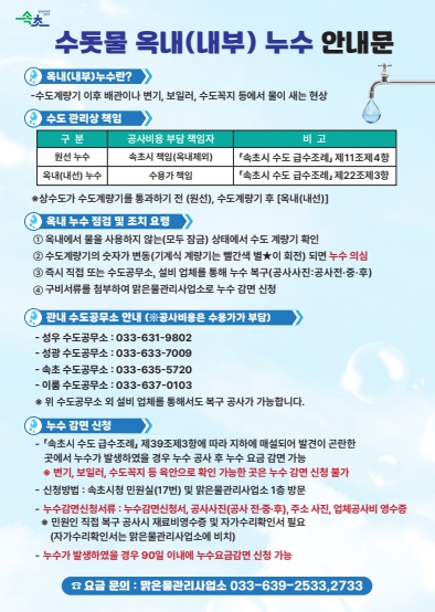 [뉴스노크=김인호 기자] 속초시가 ‘수돗물 누수 안내문’을 제작·배포하며 생활 속 물 절약 실천 확산에 나섰다.