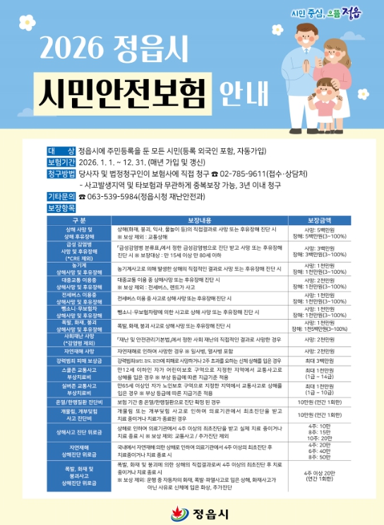 [뉴스노크=김인호 기자] 정읍시가 각종 재난과 일상 속 사고로부터 시민들을 보호하기 위해 2026년 시민안전보험의 보장 범위를 대폭 강화했다.