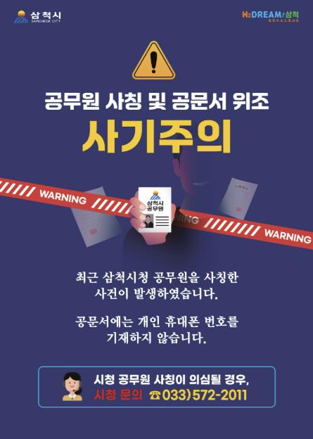 [뉴스노크=김인호 기자] 삼척시는 최근 시청 공무원을 사칭한 보이스피싱 사례가 관내에서 잇따라 발생함에 따라, 시민들의 피해 예방을 위해 각별한 주의를 당부했다.