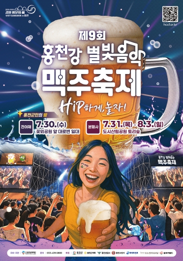 [뉴스노크=김인호 기자] 제9회 홍천강 별빛음악 맥주축제가 "Hip하게, 놀자!"라는 톡톡 튀는 슬로건 아래 7월 30일 꽃뫼공원 앞 대로변에서의 화려한 전야제를 시작으로 7월 31일부터 8월 3일까지 도시산림공원 토리숲에서 본격적으로 열린다.