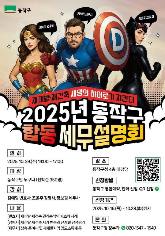 [뉴스노크=김인호 기자] 동작구가 오는 10월 29일 오후 2시, 구청 신청사 4층 대강당에서 재개발 및 재건축 분야를 주제로 ‘2025년 합동 세무 설명회’를 개최한다고 밝혔다.