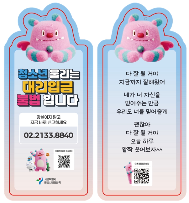 수사와 함께 예방 홍보 활동도 전면 강화한다. 서울시 소재 고등학교, 청소년센터에 책갈피형 홍보물 2만 개를 배포하고, 서울시교육청의 협조로 온라인 가정통신문 앱인 ‘스쿨벨’을 통해 학부모와 학생들에게 불법 대리입금의 위험성을 알린다. 시는 이번에 청소년의 눈높이 맞춰 홍보방법에 변화를 줬다. 기존 전단지 홍보방식에서 벗어나 청소년에게 유용한 책갈피형 홍보물을 제작했다. 책갈피의 QR을 통해 만나는 숏폼 영상에서 청소년 불법 대리입금의 피해사례와 대처 방법을 해치와 함께 친숙하게 알아가게 된다.