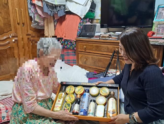 ▲ 방문 간호사가 건강 취약계층을 방문해 추석 명절맞이 후원물품을 전달하고 있다 |