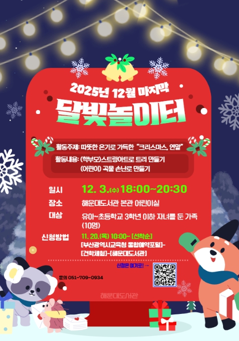 노장석 해운대도서관장은 “가족이 함께 책을 읽고 대화하며 따뜻한 마음을 나누는 시간을 통해, 한 해를 포근하게 마무리하길 바란다”라고 전했다.