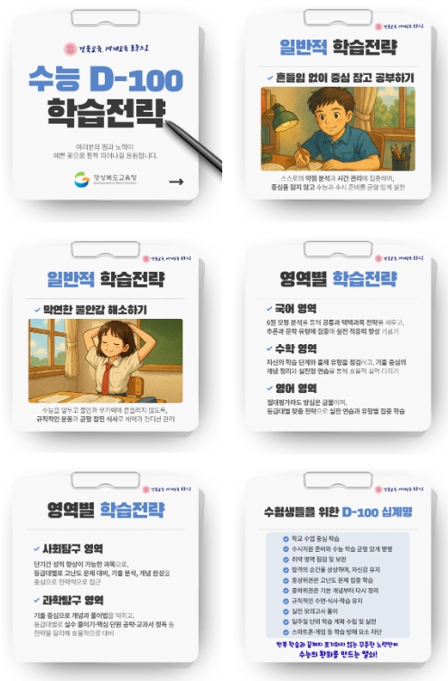 이와 함께 경북진학지원센터가 제작해 보급한 이번 ‘수능 D-100 학습 전략 자료’는 △일반적 학습 전략 △영역별 학습 전략 △멘탈 관리와 수험생 조언 등으로 구성되어 있으며, 실제 수험생들의 학습 계획 수립과 스트레스 관리에 도움이 될 수 있도록 다양한 팁이 담겨 있다.