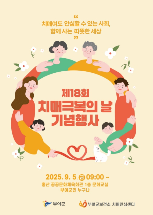 [뉴스노크=김인호 기자] 부여군은 제18회 치매극복의 날을 맞이하여 오는 9월 5일 홍산면 치매안심마을에서 ‘치매극복의 날 기념행사 및 한마음 치매극복 걷기대회’를 개최한다고 밝혔다.