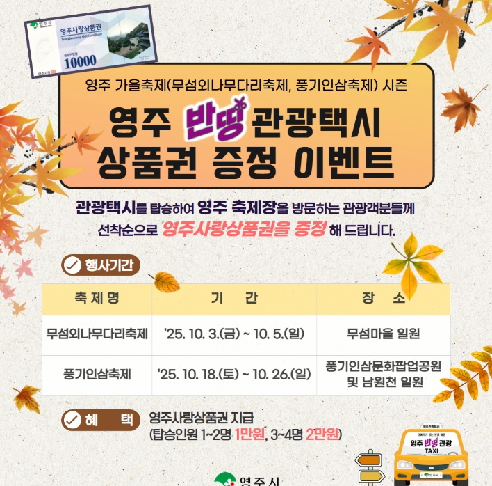[뉴스노크=김인호 기자] 가을 빛으로 물드는 10월, 영주시는 여름 축제에 이어 가을 축제 시즌에도 ‘영주 반띵관광택시’를 이용해 축제장을 찾는 관광객에게 최대 2만 원 상당의 영주사랑상품권을 증정하는 이벤트를 진행한다고 23일 밝혔다.