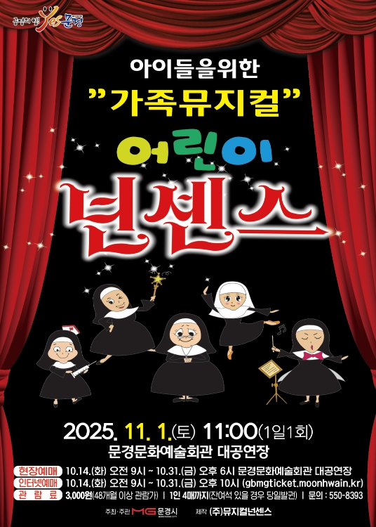 [뉴스노크=김인호 기자] 문화예술회관에서는 11월 기획공연으로 화끈하고 재미있는 수녀들의 이야기를 담은 뮤지컬 ‘어린이 넌센스’공연을 11월 1일 11:00에, 뮤지컬‘넌센스’공연을 11월 1일 17:00에 각각 문경문화예술회관 대공연장에서 진행한다.
