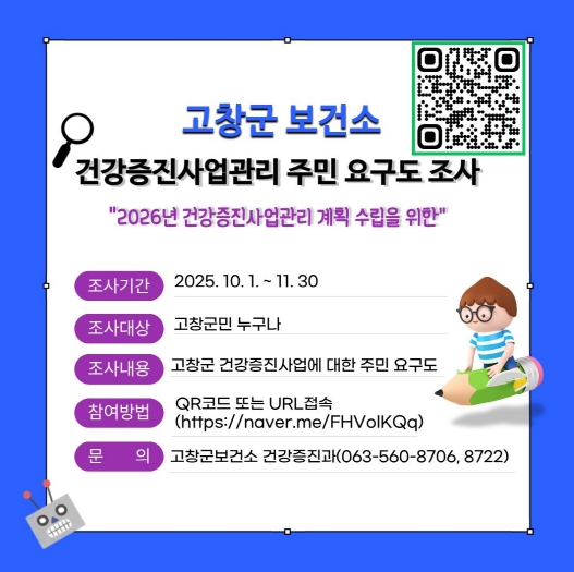 [뉴스노크=김인호 기자] 고창군보건소가 통합건강증진사업 주민요구도 조사를 11월30일까지 실시하고 있다.