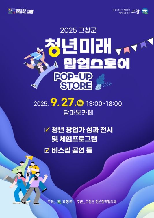 [뉴스노크=김인호 기자] 고창군은 오는 9월27일 오후 1시부터 담마북카페에서 2025 청년의 날 기념행사 ‘청년미래 팝업스토어’를 연다.