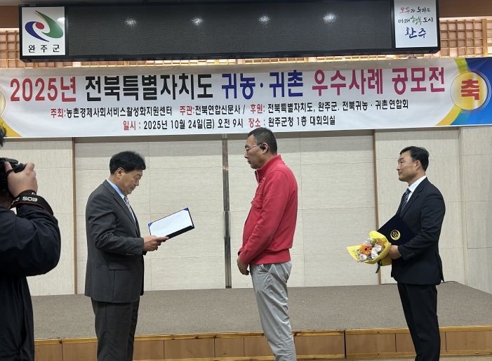 [뉴스노크=김인호 기자] 고창군 귀농인인 오세훈씨(57)가 지난 24일 열린 ‘2025 전북 귀농귀촌 우수사례 공모전’에서 우수상을 수상했다.