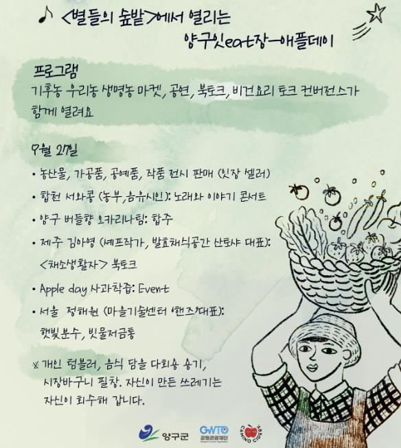 첫날인 27일에는 △양구 햇사과 착즙 시연 △소농들이 직접 운영하는 못난이 농산물 장터 △오카리나 공연 △이야기 콘서트 △태양 관측 필름 만들기 체험 등이 진행된다. 또한 커피와 빵을 비롯해 농산물·가공품, 공예품까지 다양한 상품을 만날 수 있는 마켓도 운영된다.