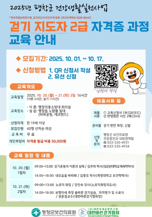 [뉴스노크=김인호 기자] 평창군보건의료원은 군민의 건강한 걷기 문화를 확산하기 위해 오는 10월 20일부터 21일까지 2일간 ‘걷기 지도자 2급 자격증 과정’ 교육을 운영한다.
