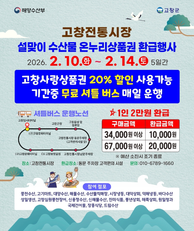 환급은 고창전통시장 동문 주차장 고객편의시설에서 받을 수 있으며, 예산 소진 시 조기 종료된다.