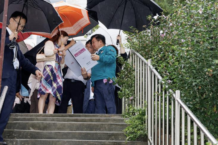 | ▲ 환일중고로 향하는 계단 통학로의 환경을 점검하고 있는 박강수 마포구청장 |