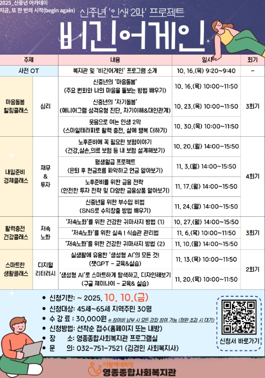 [뉴스노크=김인호 기자] 인천 중구 영종종합사회복지관은 오는 10월 16일부터 11월 24일까지 45세~65세 지역 주민을 대상으로 신중년 아카데미 ‘비긴어게인’을 운영한다고 밝혔다.