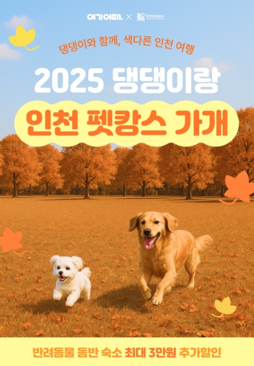 [뉴스노크=김인호 기자] 인천관광공사는 반려동물 동반 여행 활성화를 위해 대한민국 대표 종합 여행·여가 플랫폼 “여기어때”와 함께 '2025 댕댕이랑 인천 펫캉스 가개' 온라인 숙박 할인 기획전을 9월 24일부터 11월 30일까지 개최한다고 밝혔다. 이번 기획전은 반려동물과 함께하는 여행 수요가 꾸준히 증가하는 가운데, 인천을 대표적인 반려동물 친화 관광도시로 널리 알리기 위해 마련됐다.