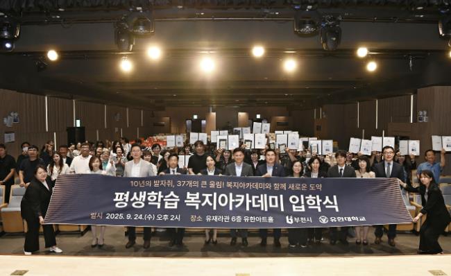 [뉴스노크=김인호 기자] 부천시는 지난 24일 유한대학교에서 ‘부천시·유한대학교 복지아카데미’ 입학식과 업무협약식을 열었다. 이번 행사는 조용익 부천시장과 장은영 유한대학교 총장을 비롯해 37개 동 지역사회보장협의체 위원장 등 150여 명이 참석한 가운데 진행됐다.