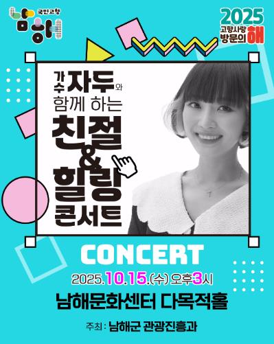 [뉴스노크=김인호 기자] 남해군은 오는 10월 15일 오후 3시, 남해문화센터 다목적홀에서 ‘가수 자두와 함께하는 친절 & 힐링 콘서트’를 개최한다.