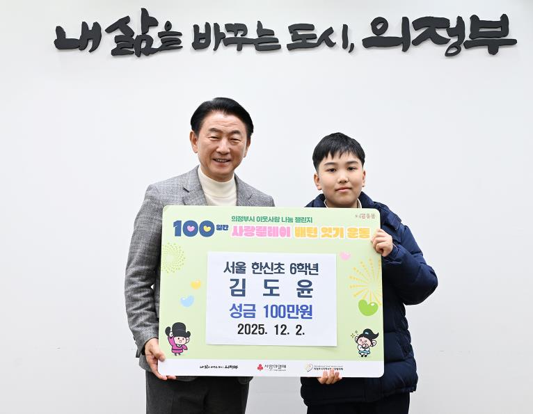 [뉴스노크=김인호 기자] 의정부시는 12월 2일 서울한신초등학교 6학년 김도윤 군이 ‘100일간 사랑릴레이 배턴 잇기’에 동참하며 성금 100만 원을 기부했다고 밝혔다.