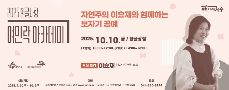 [뉴스노크=김인호 기자] 세종시문화관광재단(대표이사 박영국)은 ‘2025 한글사랑 여민락 아카데미 추석 특별강좌’를 오는 10월 10일 진행한다.