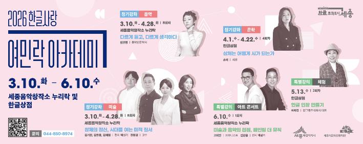 [뉴스노크=김인호 기자] 세종시문화관광재단이 2026년 한글사랑 여민락 아카데미’ 상반기 수강생을 선착순으로 모집한다.
