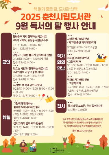 [뉴스노크=김인호 기자] 춘천 공공도서관이 ‘독서의 달’을 맞아 9월 한 달 동안 책과 함께 즐기는 다채로운 프로그램을 마련했다. 올해 주제는 ‘책 펴기 좋은 달, 도서관 산책’으로 어린이부터 성인까지 전 세대가 함께 즐길 수 있는 10개 프로그램이 마련됐다.