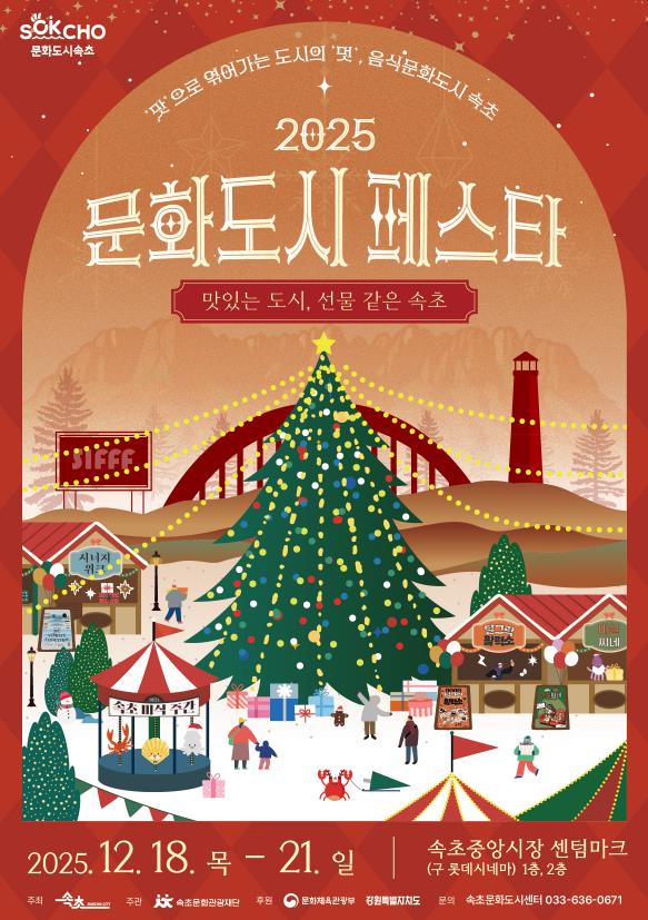 [뉴스노크=김인호 기자] (재)속초문화관광재단은 속초시의 대한민국 문화도시 1년 차 사업을 마무리하며 오는 12월 18일부터 21일까지 4일간 속초중앙시장 센텀마크(구 롯데시네마) 에서 대한민국 문화도시 성과공유회‘2025 문화도시 페스타’를 개최한다.