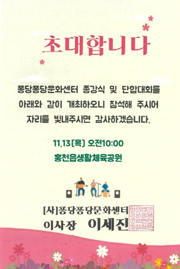 [뉴스노크=김인호 기자] 홍천군은 11월 13일, 홍천읍 생활체육공원에서 '제4회 퐁당퐁당 문화센터 종강식 및 단합대회'를 개최한다고 밝혔다.