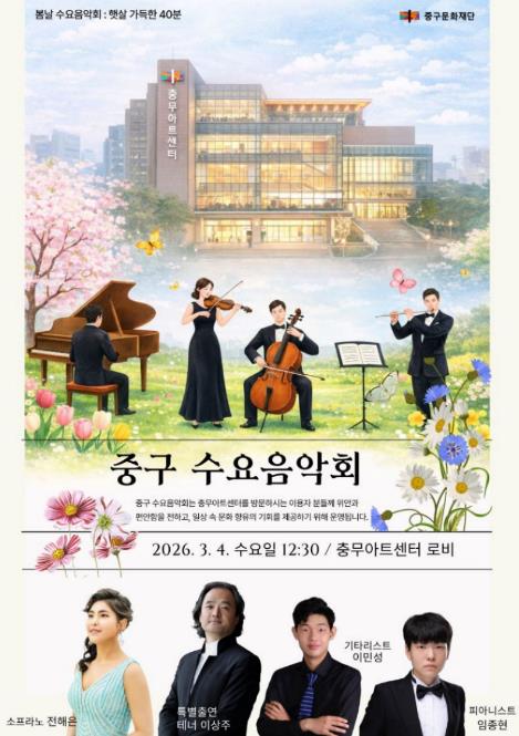 수요음악회의 첫 시작을 알리는 이번 공연은 봄의 정취를 담은 무대로 꾸며진다. 소프라노 전해은, 피아니스트 임종현, 기타리스트 이민성이 출연하고, 중구 가요합창단 지휘자인 테너 이상주가 특별출연한다. 클래식을 중심으로 국내외 다양한 무대에서 활동해온 연주자들이 성악, 피아노, 기타 연주 등 풍성한 프로그램을 통해 깊이 있는 음악적 경험을 선사할 예정이다. 특히 이번 무대에는 발달장애 아티스트들이 함께해 공연에 따뜻한 감동을 더할 것으로 기대된다.