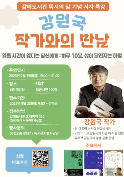 [뉴스노크=김인호 기자] 구리시 갈매도서관은 독서의 달을 기념하여 시민들에게 책과 더욱 가까워질 수 있는 기회를 제공하고자 9월 19일 금요일 베스트셀러 작가 강원국을 초청해 작가와의 만남을 운영한다.