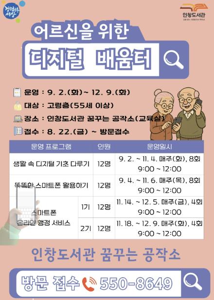 [뉴스노크=김인호 기자] 구리시 인창도서관 메이커스페이스 ‘꿈꾸는 공작소’는 9월 2일부터 12월 9일까지 고령층 시민의 디지털 이해력 향상과 정보적 참여 기회 확대를 위한 '2025년 디지털 배움터'를 운영한다.