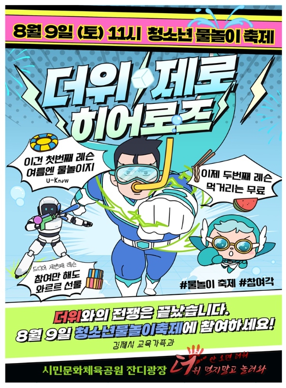 [뉴스노크=김인호 기자] 김제시는 오는 8월 9일, 시민문화체육공원 잔디광장에서 ‘제4회 김제시 청소년의 날 기념 물놀이 축제’를 개최해, 무더운 여름을 날려줄 청소년 맞춤형 즐길 거리와 볼거리로 가득한 하루를 선사한다고 밝혔다.