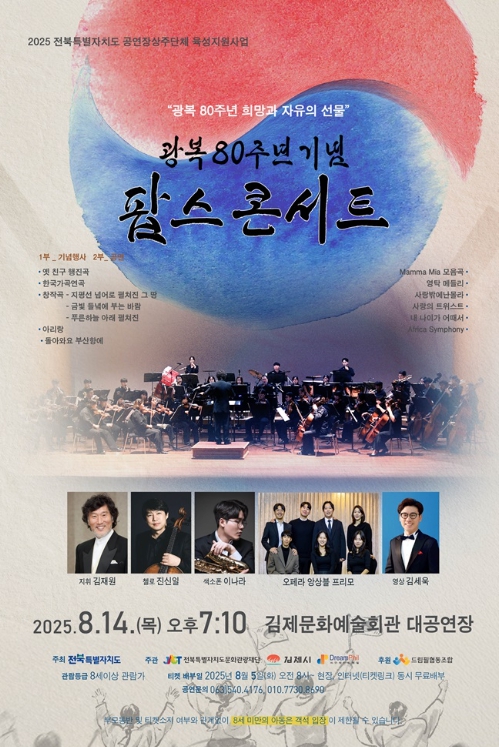 [뉴스노크=김인호 기자] 광복 80주년을 맞아, 특별한 음악회로 시민과 함께하는 '광복 80주년 기념 팝스 콘서트'가 오는 8월 14일 오후 7시 10분 김제문화예술회관 대공연장에서 펼쳐진다.