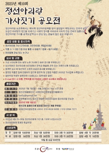 이번 공모전은 제50회 아리랑제를 맞아 모든 아리랑의 원형으로 불리는 정선아리랑의 정신을 되새기고, 민족의 삶과 감정을 담아낸 새로운 가사를 통해 아리랑의 지속적인 전승과 창작을 이어가고자 마련됐다.