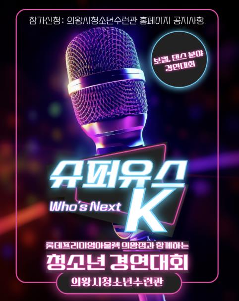 [뉴스노크=김인호 기자] 의왕시청소년재단 산하 의왕시청소년수련관은 오는 8월 1일부터 14일까지 만 13~18세 청소년을 대상으로 롯데프리미엄아울렛 의왕점과 함께하는 청소년 경연대회 '슈퍼유스 K' 참가자를 모집한다.