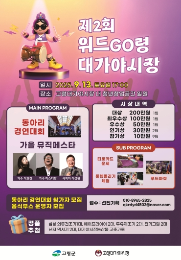 한편, 동아리 경연대회 및 플리마켓 등 참가를 희망하는 개인이나 단체는 고령대가야시장 홈페이지 등을 통해 신청․접수가 가능하다.