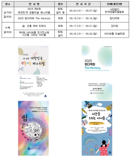 서북 갤러리에서는 ▲9월 17일에서 21일, 쉼, 선을 따라 흐르다 ▲9월 24일에서 28일, 제5회 아이퍼플 정기전시회 시간을 그리는 아이들 전시가 진행된다.