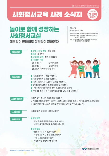 이번 소식지는 교실에서 실천된 창의적이고 따뜻한 사회정서교육 사례를 중심으로 구성됐으며 놀이‧협력‧공감‧자기이해를 바탕으로 학생들의 사회정서역량을 기르는 다양한 활동을 소개하고 있다.