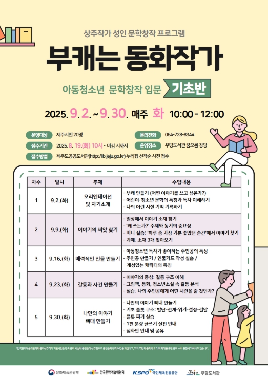 [뉴스노크=김인호 기자] 제주시 우당도서관은 문학상주작가 노수미 작가와 함께하는 성인 대상 아동청소년 문학창작 입문 프로그램 ‘부캐는 동화작가’의 참여자를 모집한다.