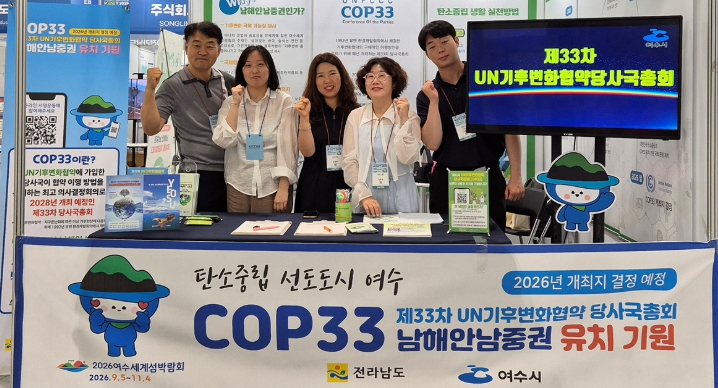 [뉴스노크=김인호 기자] 여수시는 지난 9일부터 3일간 광주광역시 김대중컨벤션센터 열린 ‘2025 대한민국 기후환경 에너지 대전(KEET2025)’에 참가해 제33차 UN기후변화협약 당사국총회(COP33)의 남해안 남중권 유치를 위한 홍보 활동을 펼쳤다.