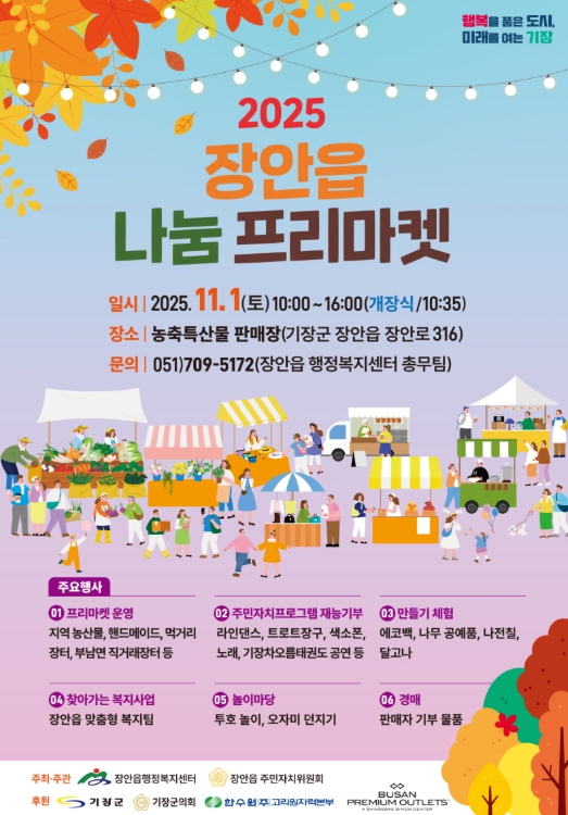 [뉴스노크=김인호 기자] 기장군 장안읍은 풍요로운 가을을 맞아 오는 11월 1일(토) 농축특산물 판매장(장안읍 장안로 316)에서 장안읍 주민자치위원회 주관으로 자연과 문화가 함께하는 2025년 ‘장안읍 나눔 프리마켓’을 개최한다고 31일 밝혔다.